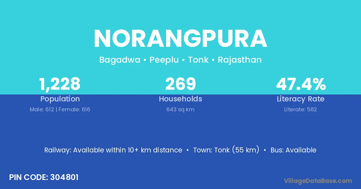 Norangpura village has a total population of 2,404 people, of which 1,226 are males and 1,178 are females.