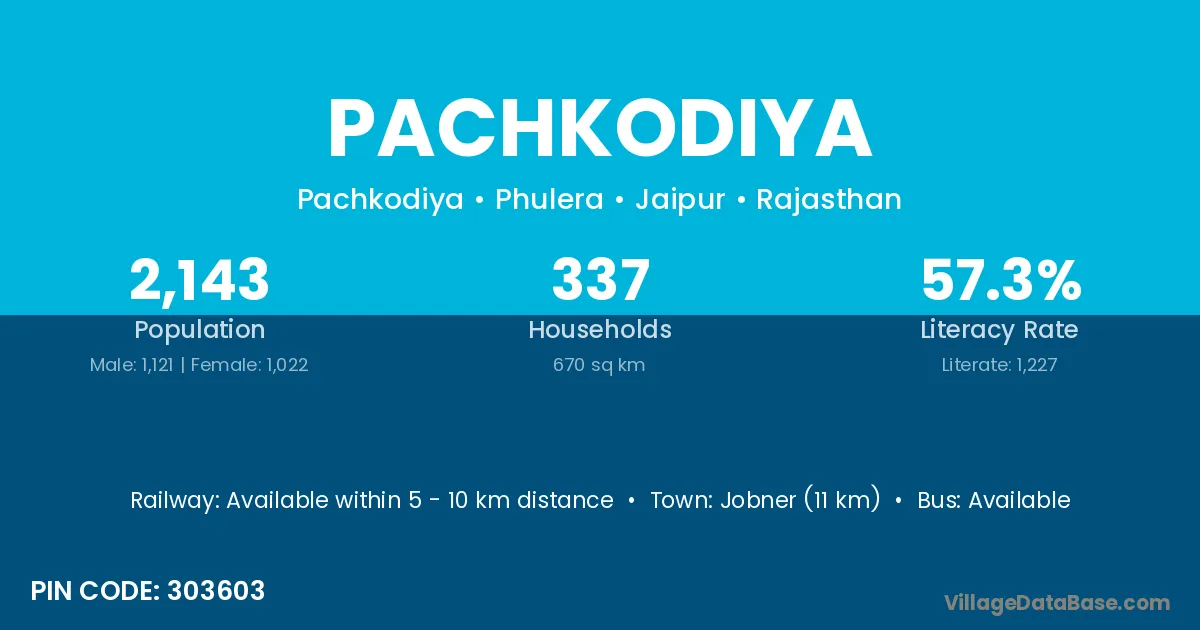Jobner (11 km) is the nearest town to Pachkodiya village for major economic activities and is located approximately 11 km away.