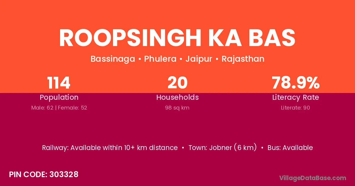 Roopsingh Ka Bas village has a total population of 114 people, of which 62 are males and 52 are females.