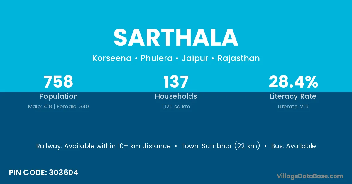 Sambhar (22 km) is the nearest town to Sarthala village for major economic activities and is located approximately 22 km away.