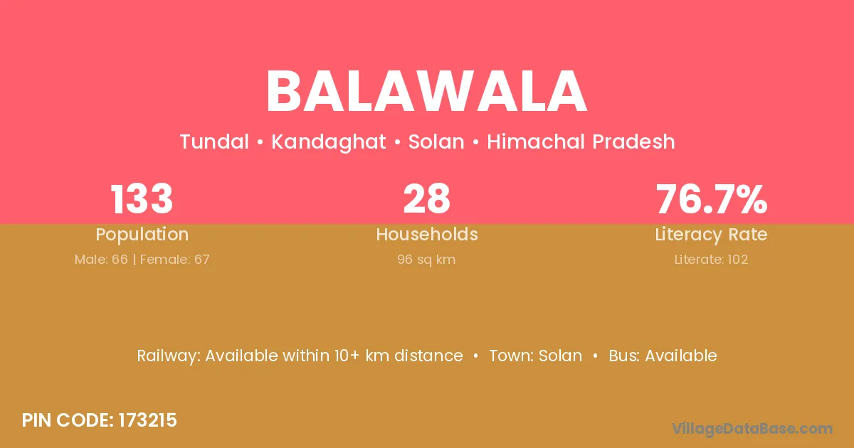The literacy rate of Balawala village is 66.07%. Male literacy stands at 76.38% and female literacy at 54.93%.
