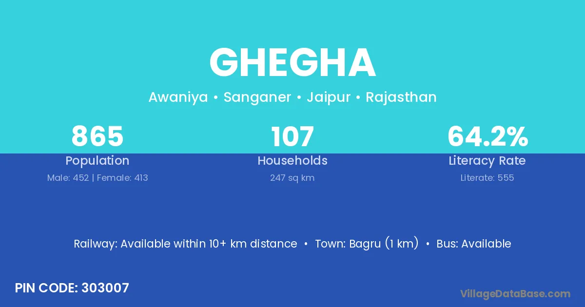 Bagru (1 km) is the nearest town to Ghegha village for major economic activities and is located approximately 1 km away.