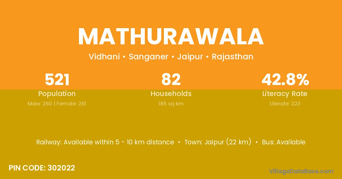 Jaipur (22 km) is the nearest town to Mathurawala village for major economic activities and is located approximately 22 km away.