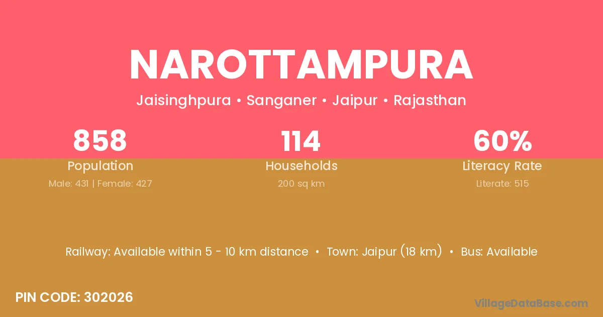 Jaipur (18 km) is the nearest town to Narottampura village for major economic activities and is located approximately 18 km away.