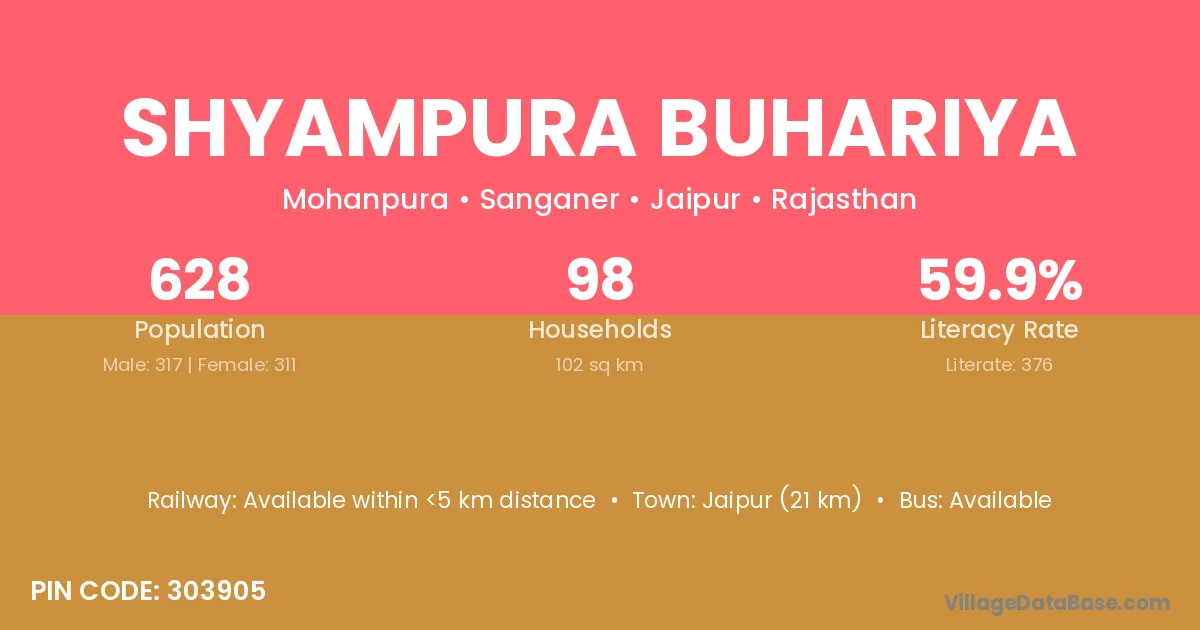 Jaipur (21 km) is the nearest town to Shyampura Buhariya village for major economic activities and is located approximately 21 km away.