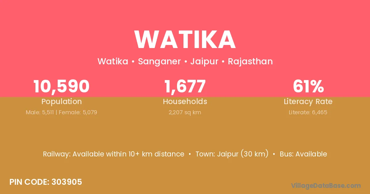 Jaipur (30 km) is the nearest town to Watika village for major economic activities and is located approximately 30 km away.