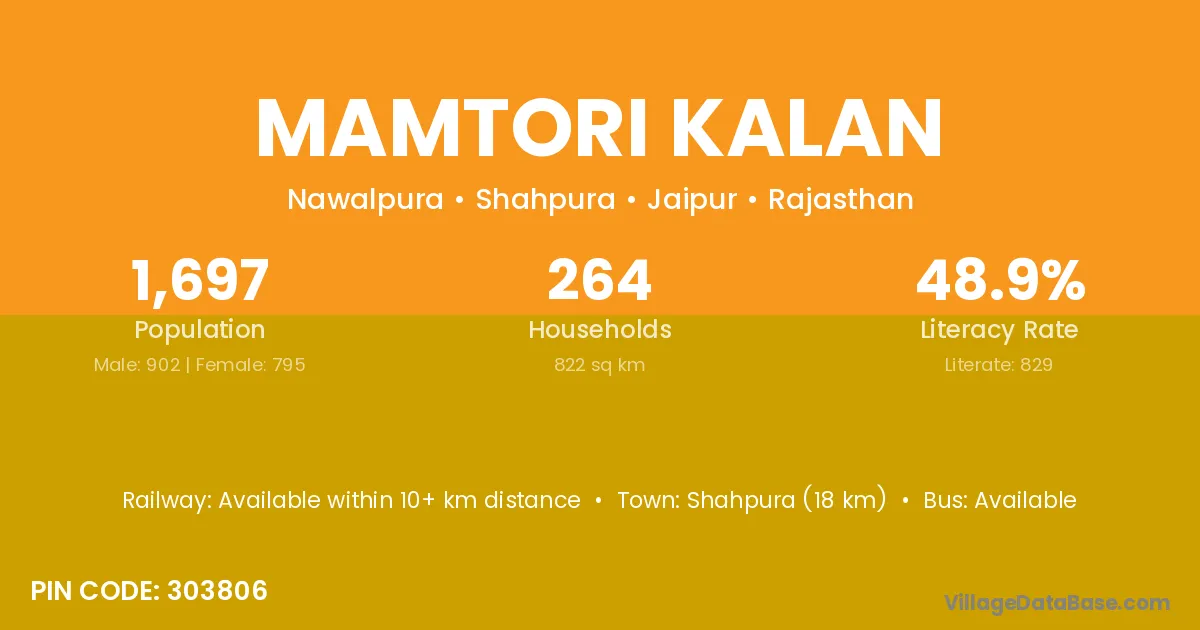 Shahpura (18 km) is the nearest town to Mamtori Kalan village for major economic activities and is located approximately 18 km away.