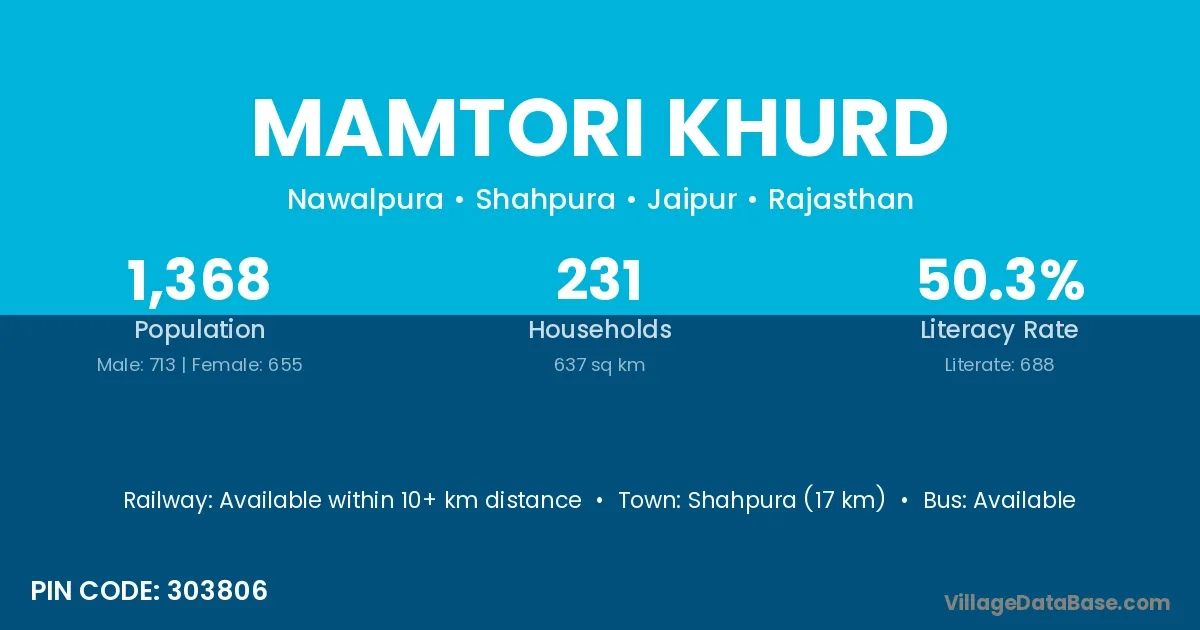 Shahpura (17 km) is the nearest town to Mamtori Khurd village for major economic activities and is located approximately 17 km away.