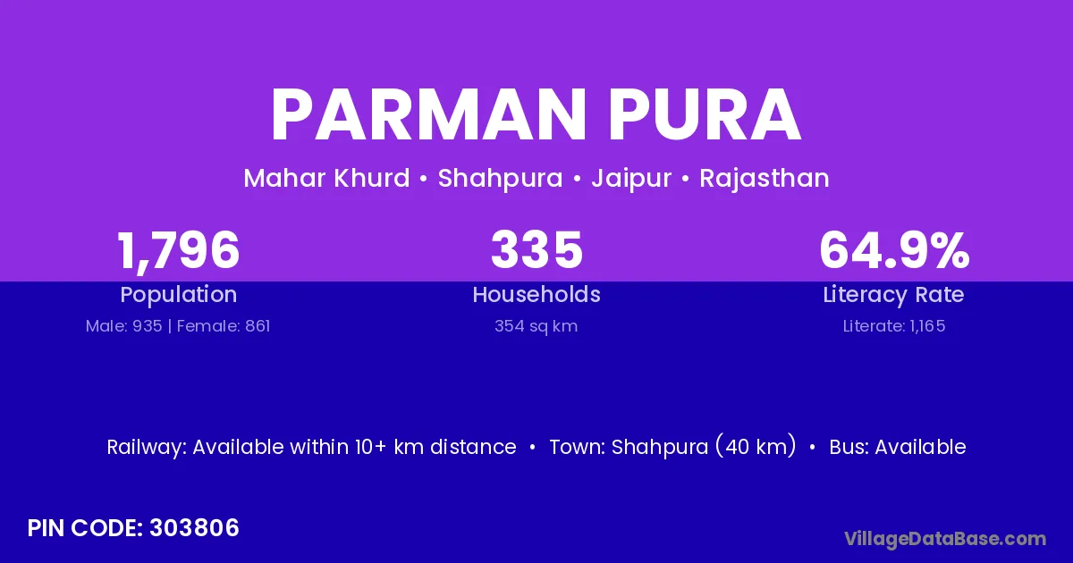 Shahpura (40 km) is the nearest town to Parman Pura village for major economic activities and is located approximately 40 km away.
