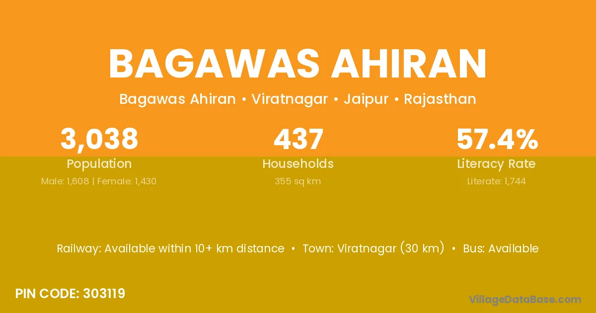 Viratnagar (30 km) is the nearest town to Bagawas Ahiran village for major economic activities and is located approximately 30 km away.
