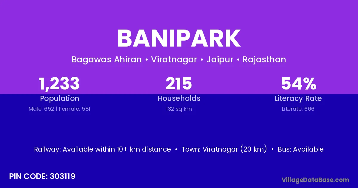 Viratnagar (20 km) is the nearest town to Banipark village for major economic activities and is located approximately 20 km away.