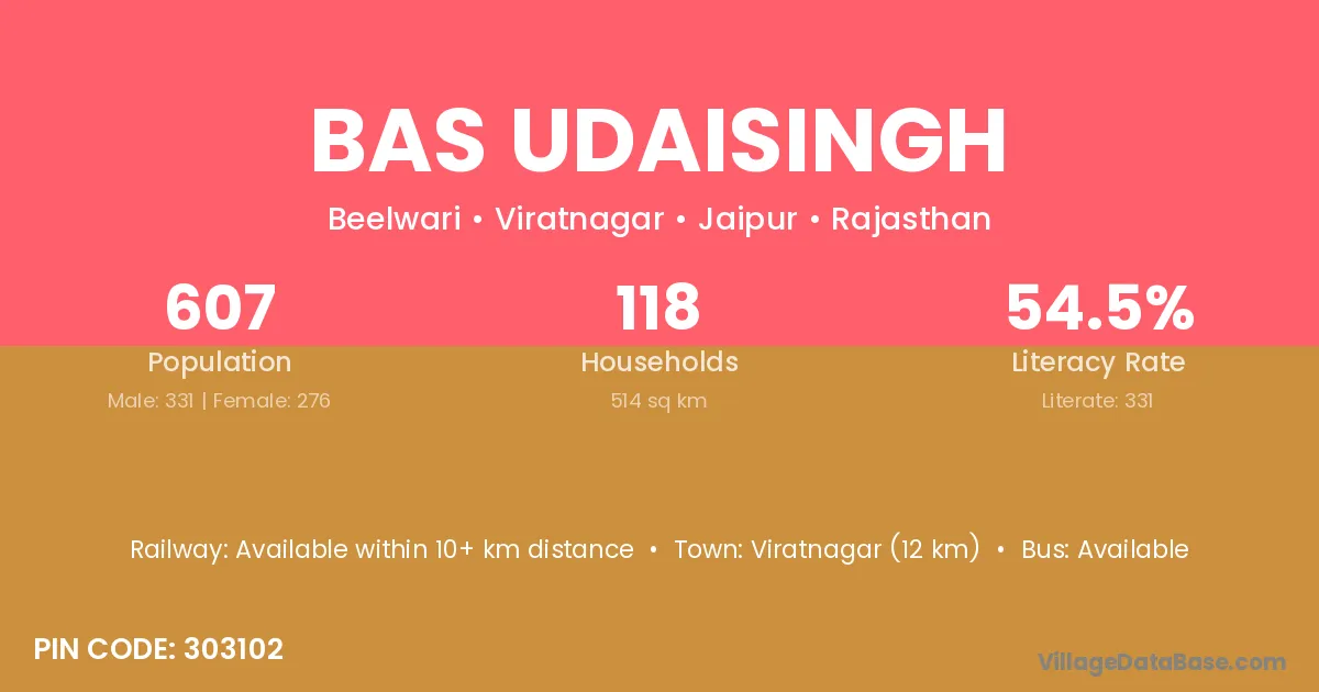 Viratnagar (12 km) is the nearest town to Bas Udaisingh village for major economic activities and is located approximately 12 km away.