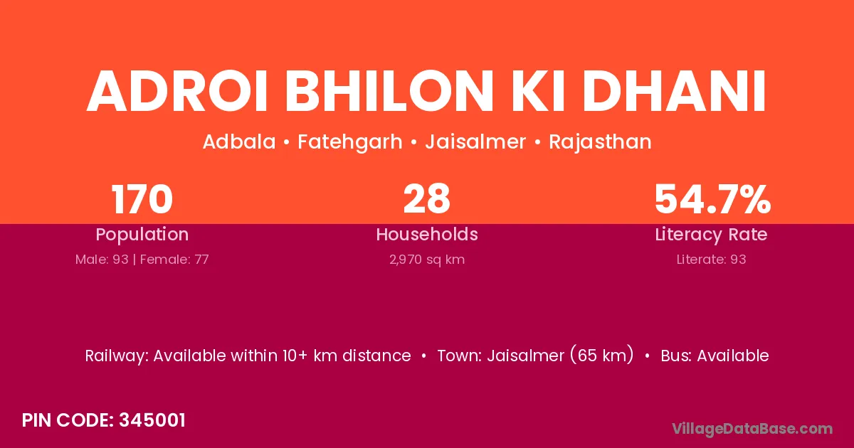 Jaisalmer (65 km) is the nearest town to Adroi Bhilon Ki Dhani village for major economic activities and is located approximately 65 km away.