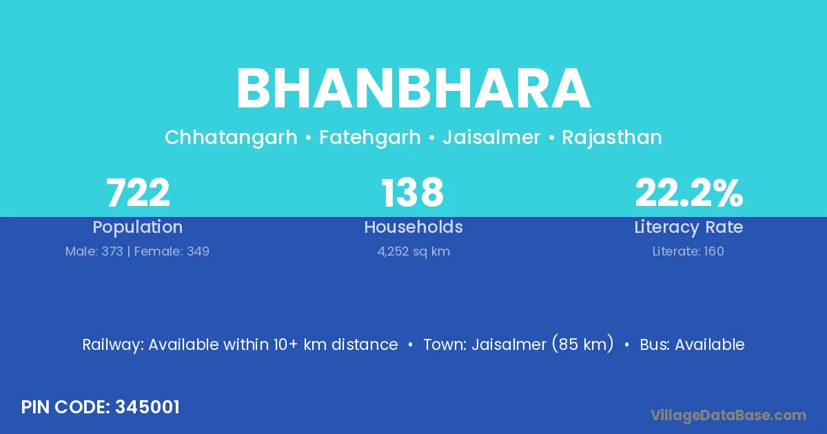 Jaisalmer (85 km) is the nearest town to Bhanbhara village for major economic activities and is located approximately 85 km away.