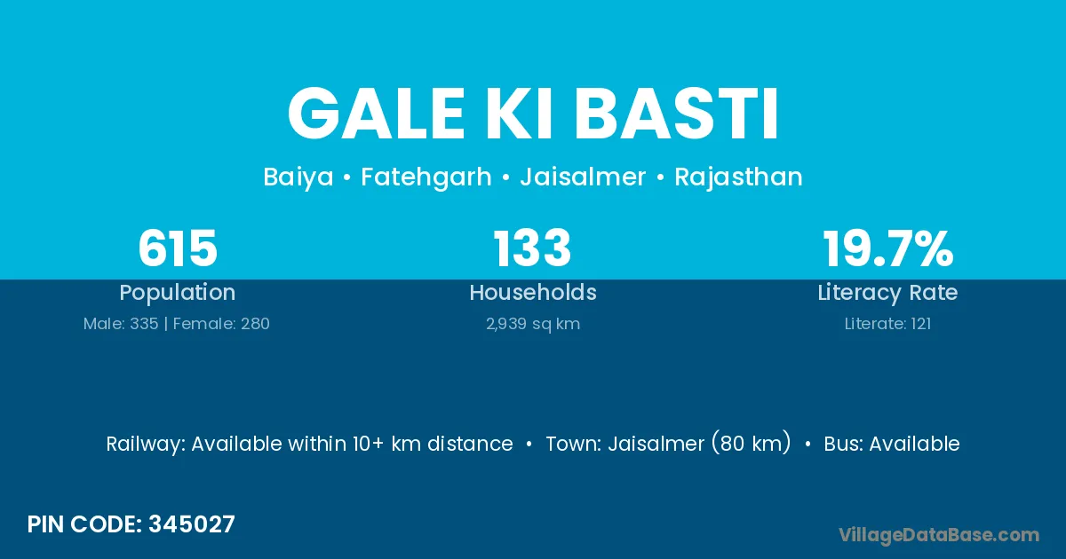 Jaisalmer (80 km) is the nearest town to Gale Ki Basti village for major economic activities and is located approximately 80 km away.