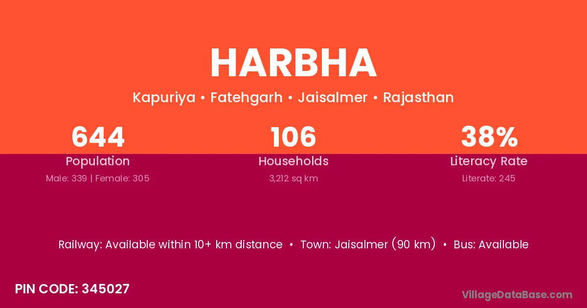 Jaisalmer (90 km) is the nearest town to Harbha village for major economic activities and is located approximately 90 km away.