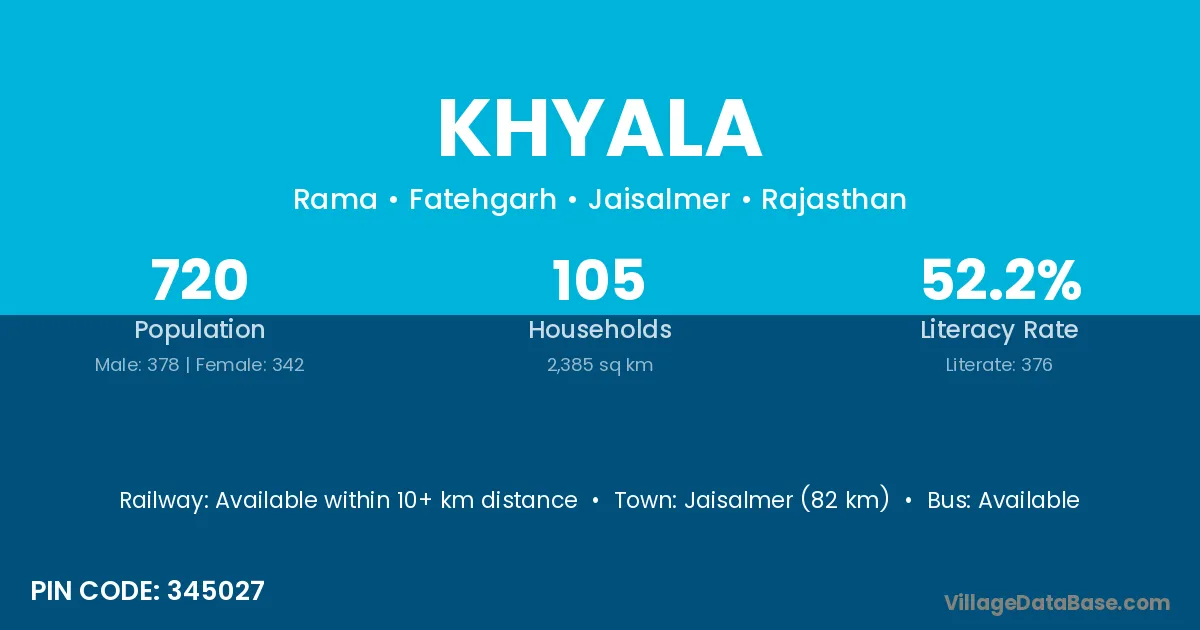 Jaisalmer (82 km) is the nearest town to Khyala village for major economic activities and is located approximately 82 km away.