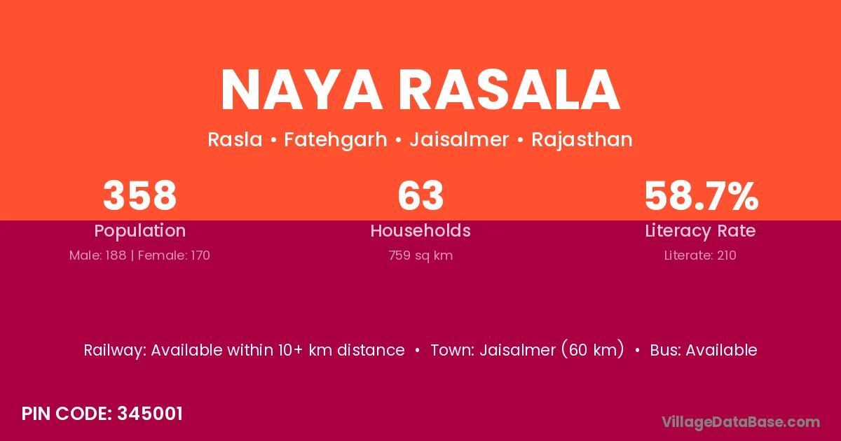 Jaisalmer (60 km) is the nearest town to Naya Rasala village for major economic activities and is located approximately 60 km away.