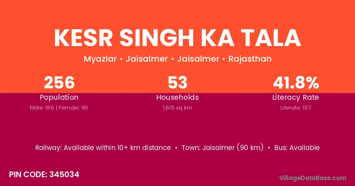 Kesr Singh Ka Tala village has a total population of 256 people, of which 166 are males and 90 are females.