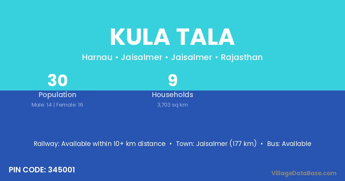 Jaisalmer (177 km) is the nearest town to Kula Tala village for major economic activities and is located approximately 177 km away.