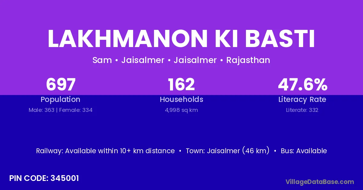 Jaisalmer (46 km) is the nearest town to Lakhmanon Ki Basti village for major economic activities and is located approximately 46 km away.