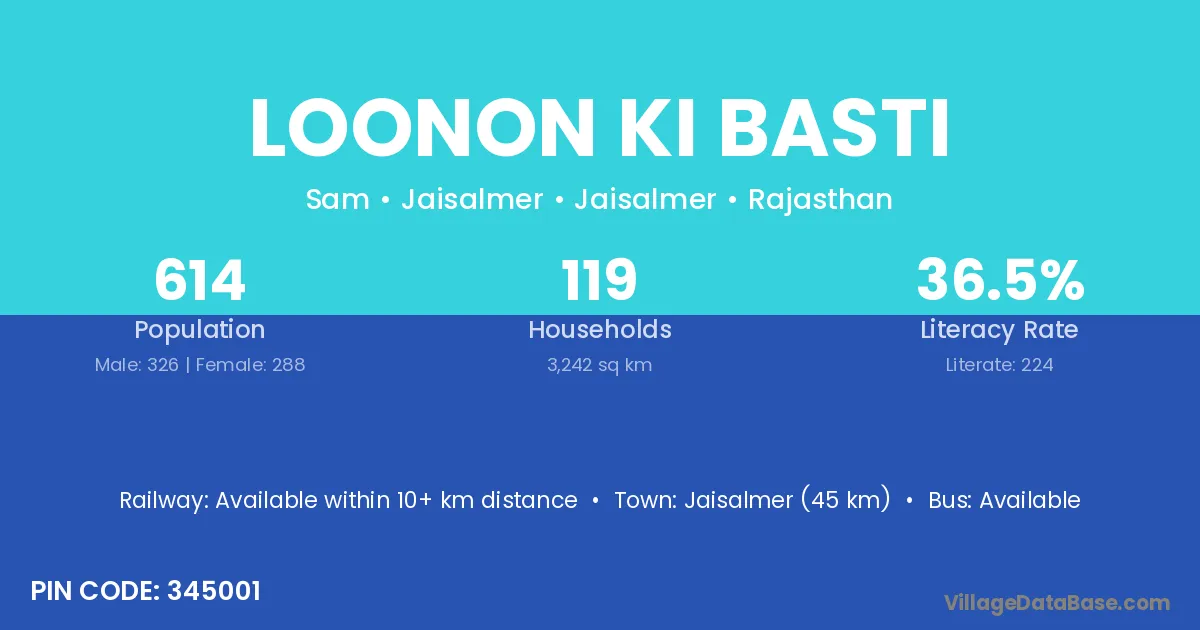 Jaisalmer (45 km) is the nearest town to Loonon Ki Basti village for major economic activities and is located approximately 45 km away.