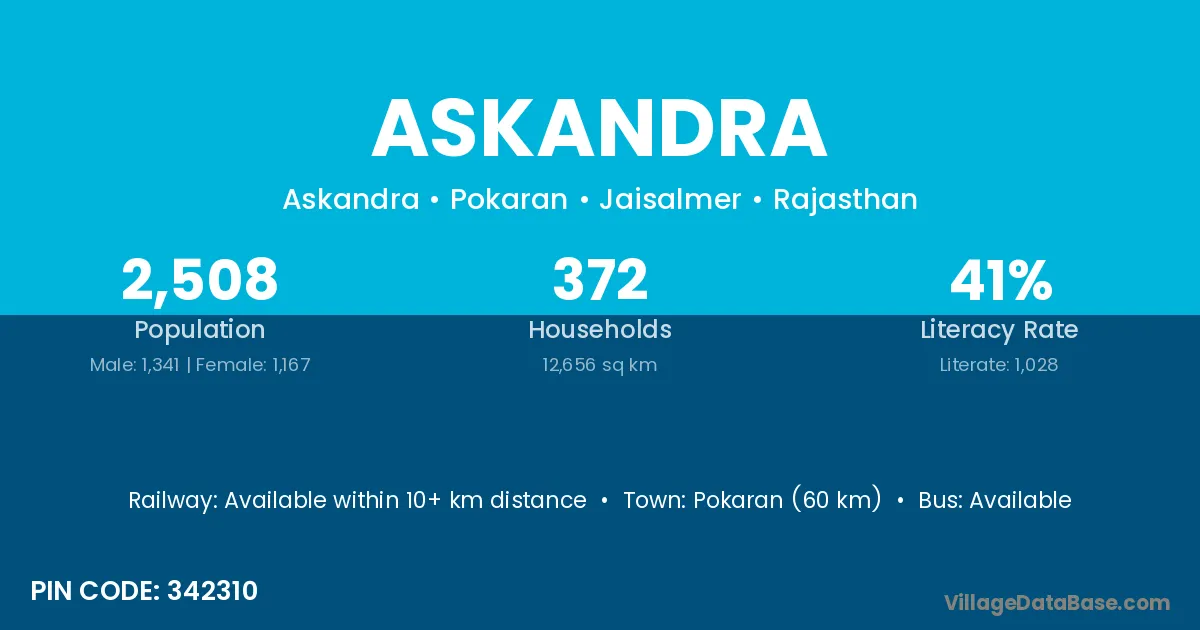 Pokaran (60 km) is the nearest town to Askandra village for major economic activities and is located approximately 60 km away.