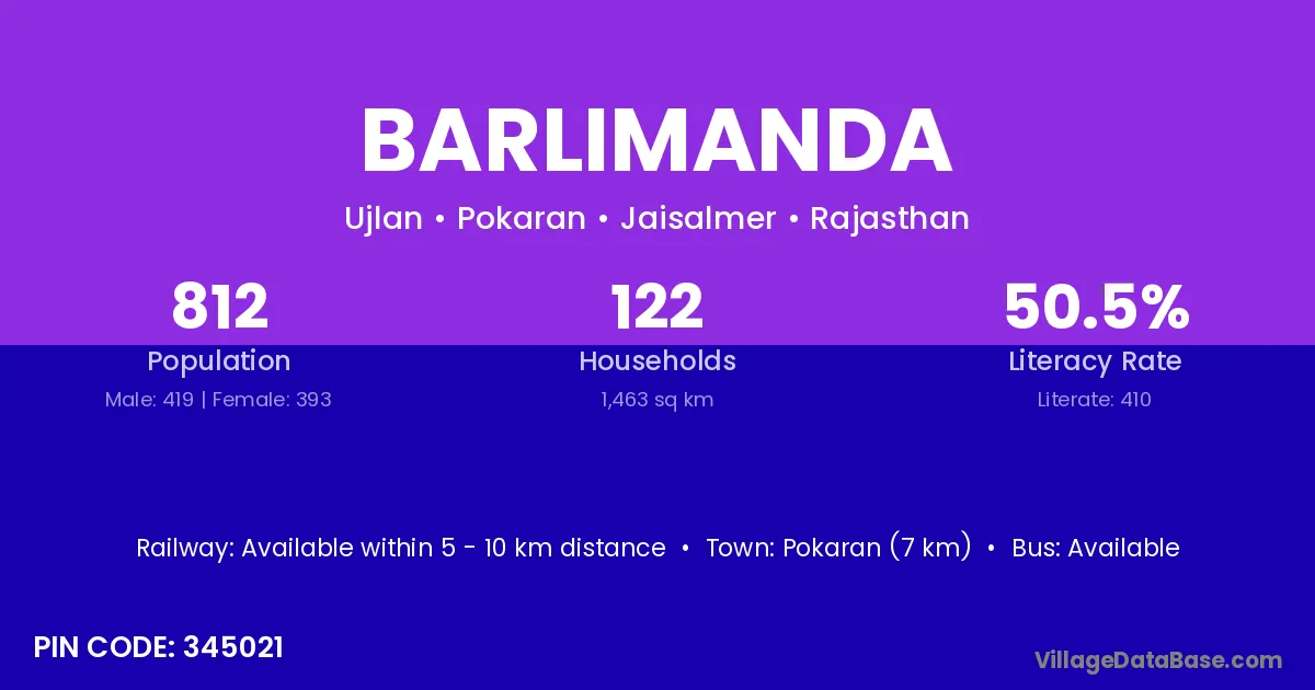 Pokaran (7 km) is the nearest town to Barlimanda village for major economic activities and is located approximately 7 km away.