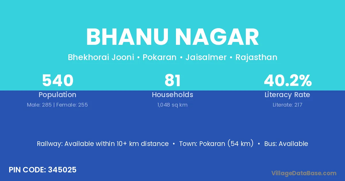 Pokaran (54 km) is the nearest town to Bhanu Nagar village for major economic activities and is located approximately 54 km away.