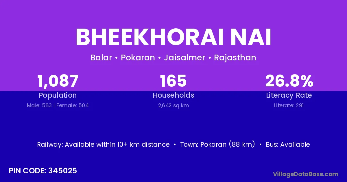 Pokaran (88 km) is the nearest town to Bheekhorai Nai village for major economic activities and is located approximately 88 km away.