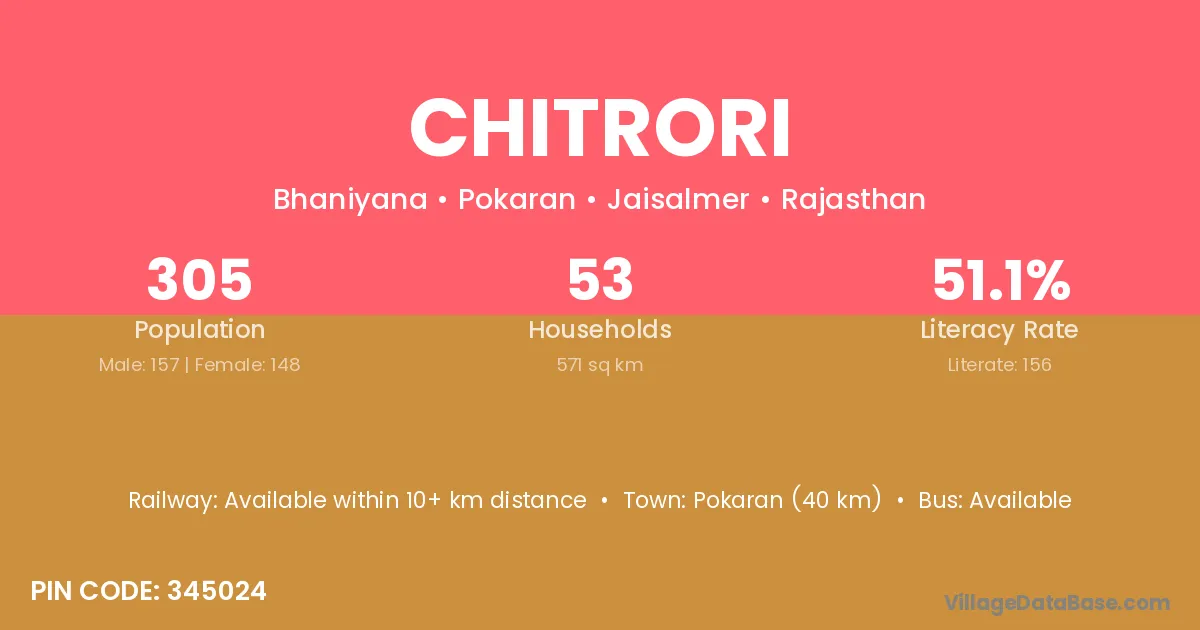 Pokaran (40 km) is the nearest town to Chitrori village for major economic activities and is located approximately 40 km away.