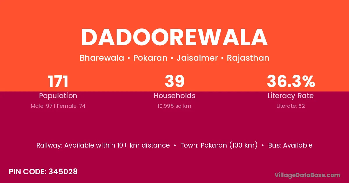 Pokaran (100 km) is the nearest town to Dadoorewala village for major economic activities and is located approximately 100 km away.