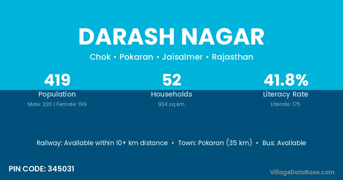 Pokaran (35 km) is the nearest town to Darash Nagar village for major economic activities and is located approximately 35 km away.