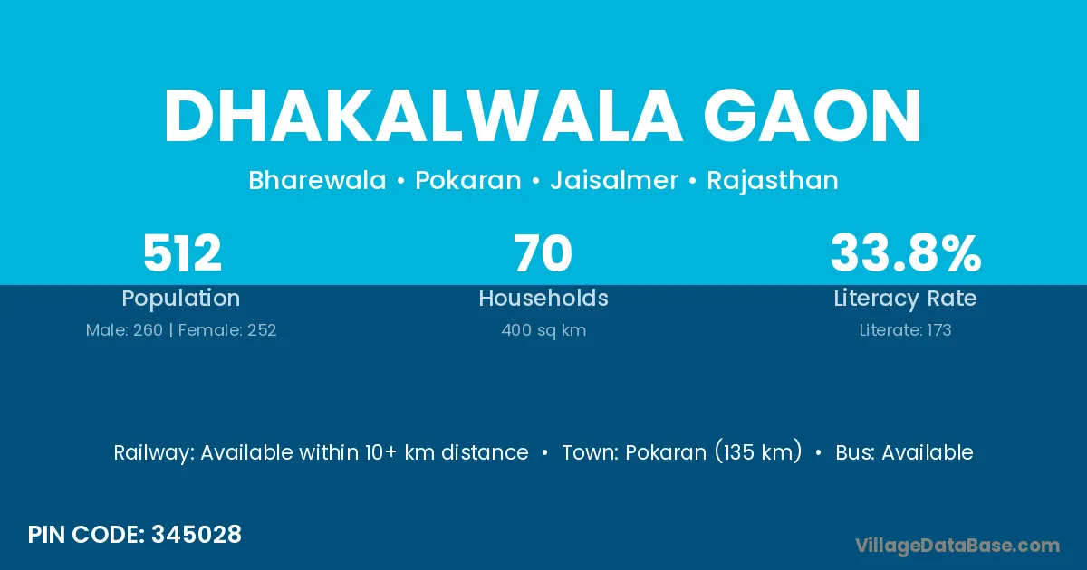Pokaran (135 km) is the nearest town to Dhakalwala Gaon village for major economic activities and is located approximately 135 km away.