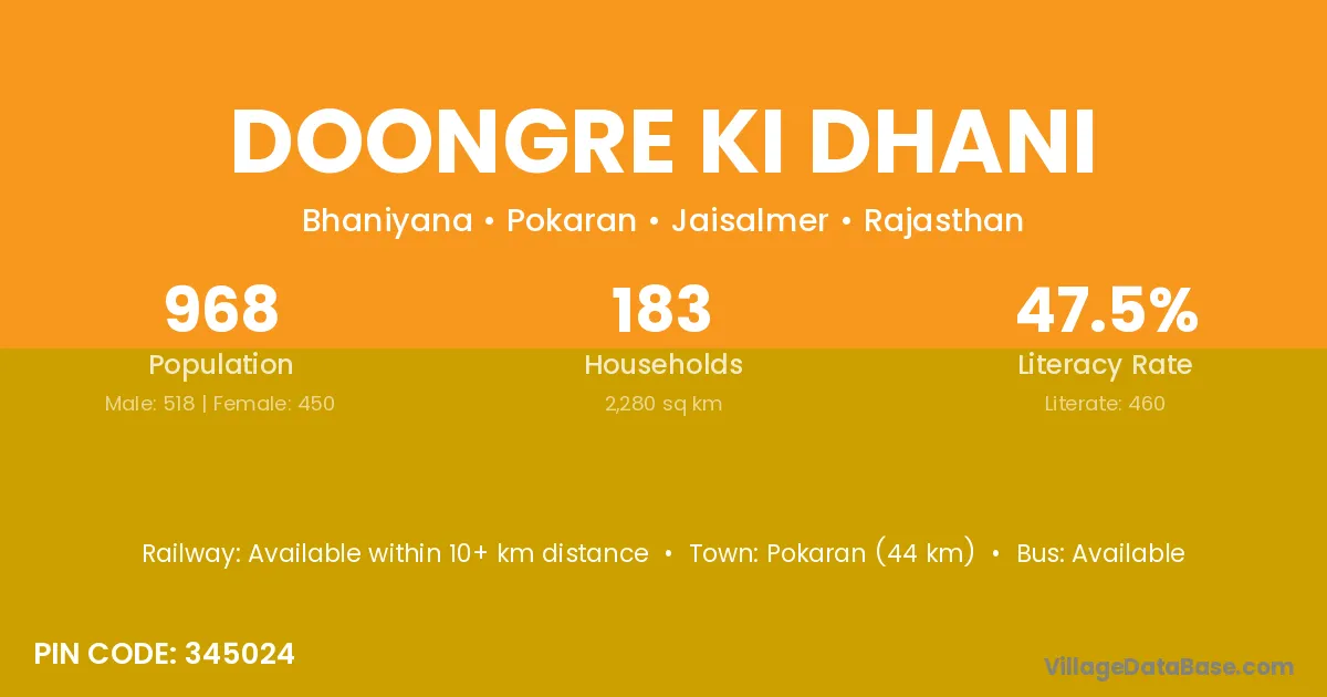 Pokaran (44 km) is the nearest town to Doongre Ki Dhani village for major economic activities and is located approximately 44 km away.