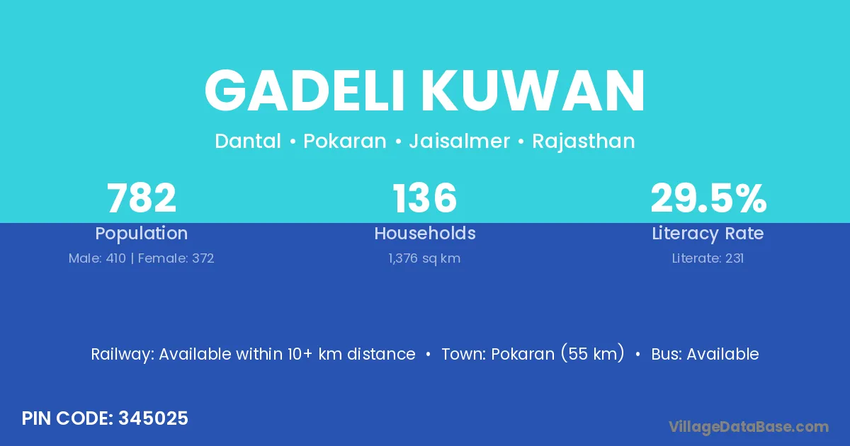 Pokaran (55 km) is the nearest town to Gadeli Kuwan village for major economic activities and is located approximately 55 km away.