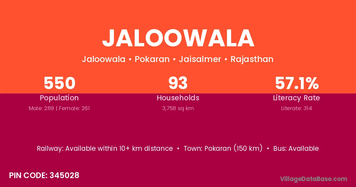 Pokaran (150 km) is the nearest town to Jaloowala village for major economic activities and is located approximately 150 km away.