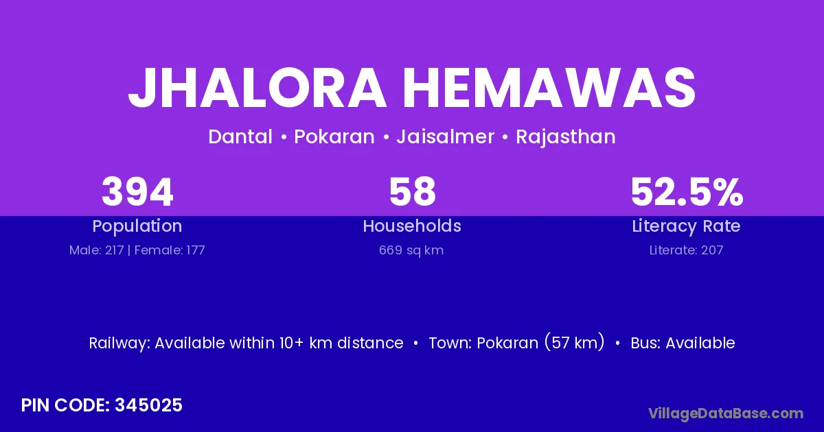 Pokaran (57 km) is the nearest town to Jhalora Hemawas village for major economic activities and is located approximately 57 km away.