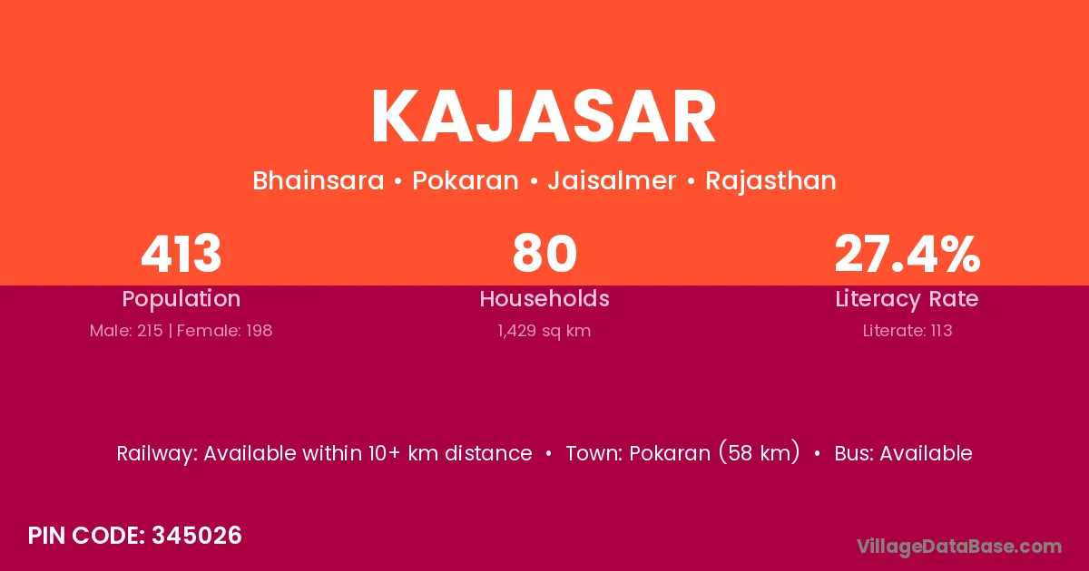 Pokaran (58 km) is the nearest town to Kajasar village for major economic activities and is located approximately 58 km away.