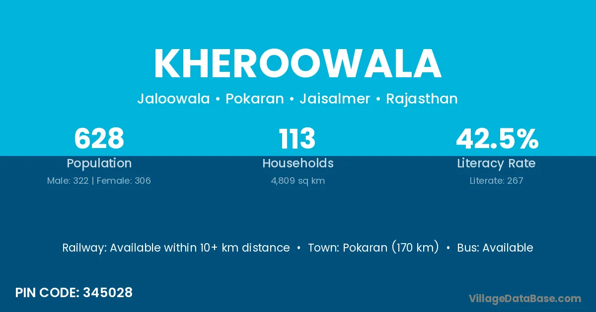 Pokaran (170 km) is the nearest town to Kheroowala village for major economic activities and is located approximately 170 km away.