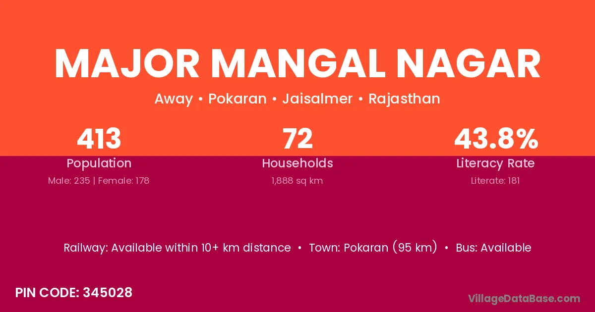 Pokaran (95 km) is the nearest town to Major Mangal Nagar village for major economic activities and is located approximately 95 km away.