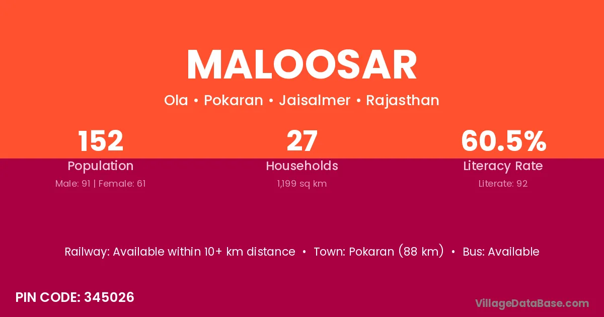 Pokaran (88 km) is the nearest town to Maloosar village for major economic activities and is located approximately 88 km away.