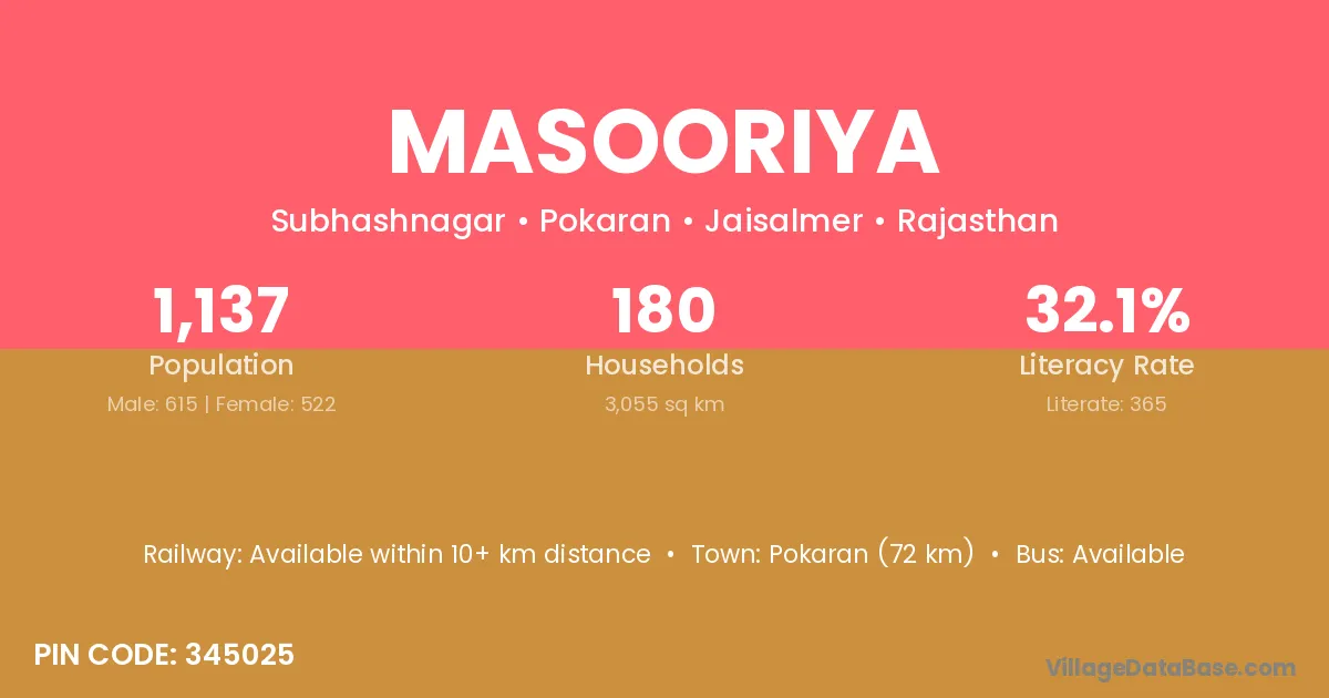 Pokaran (72 km) is the nearest town to Masooriya village for major economic activities and is located approximately 72 km away.