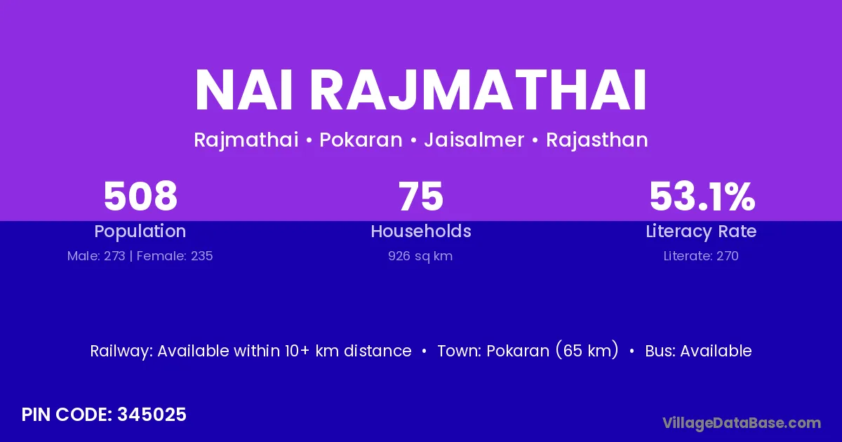Pokaran (65 km) is the nearest town to Nai Rajmathai village for major economic activities and is located approximately 65 km away.