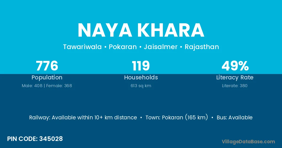Pokaran (165 km) is the nearest town to Naya Khara village for major economic activities and is located approximately 165 km away.