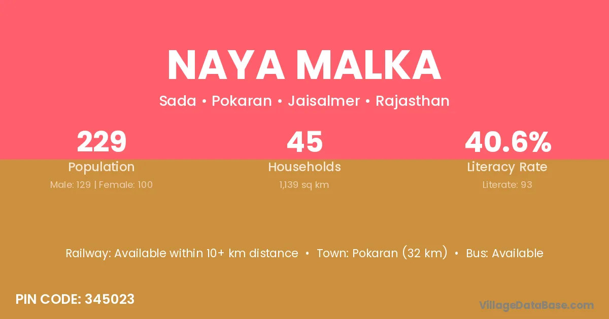 Pokaran (32 km) is the nearest town to Naya Malka village for major economic activities and is located approximately 32 km away.