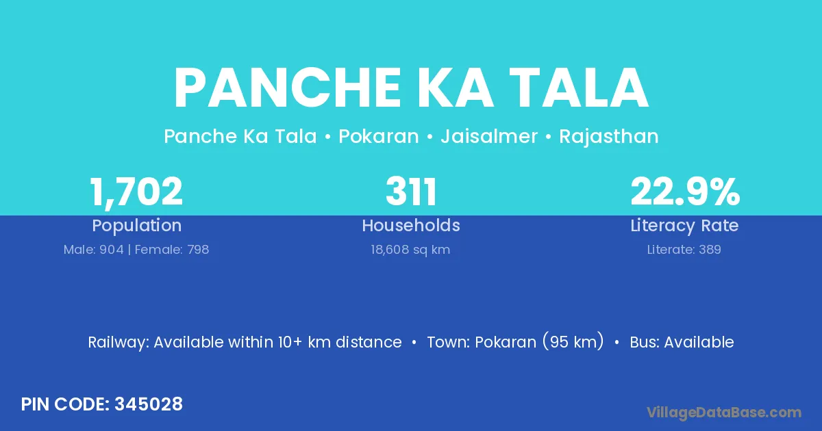 Pokaran (95 km) is the nearest town to Panche Ka Tala village for major economic activities and is located approximately 95 km away.