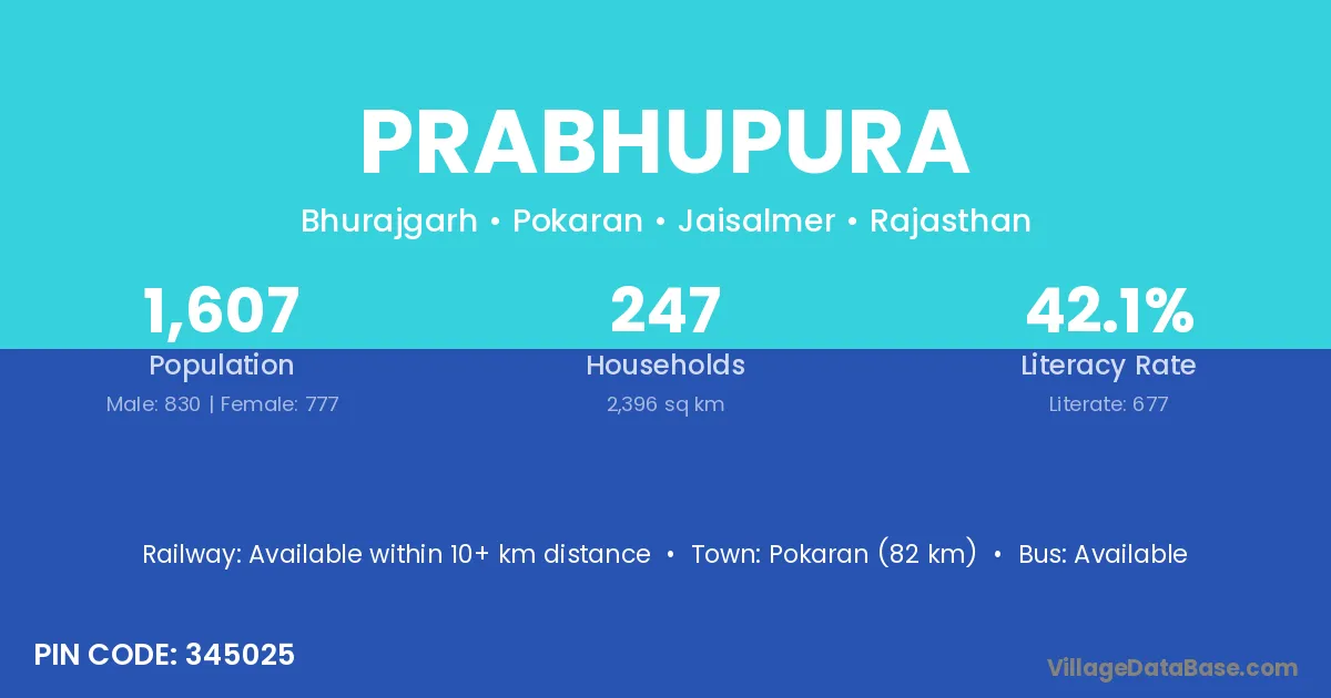 Pokaran (82 km) is the nearest town to Prabhupura village for major economic activities and is located approximately 82 km away.