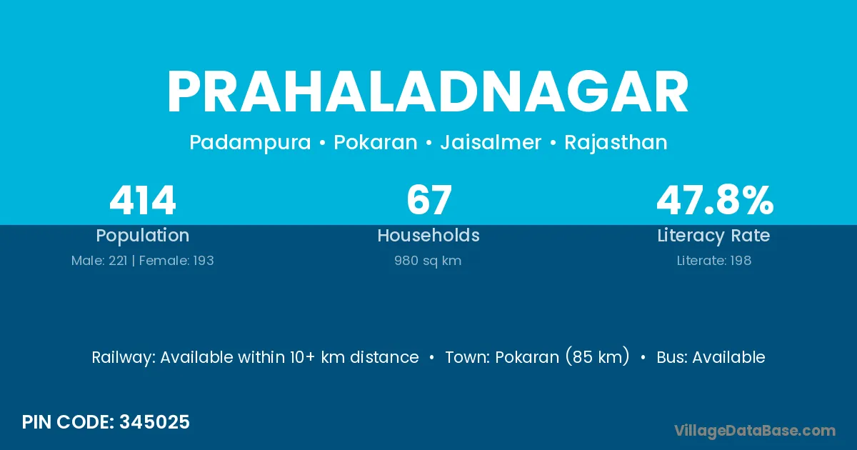 Pokaran (85 km) is the nearest town to Prahaladnagar village for major economic activities and is located approximately 85 km away.