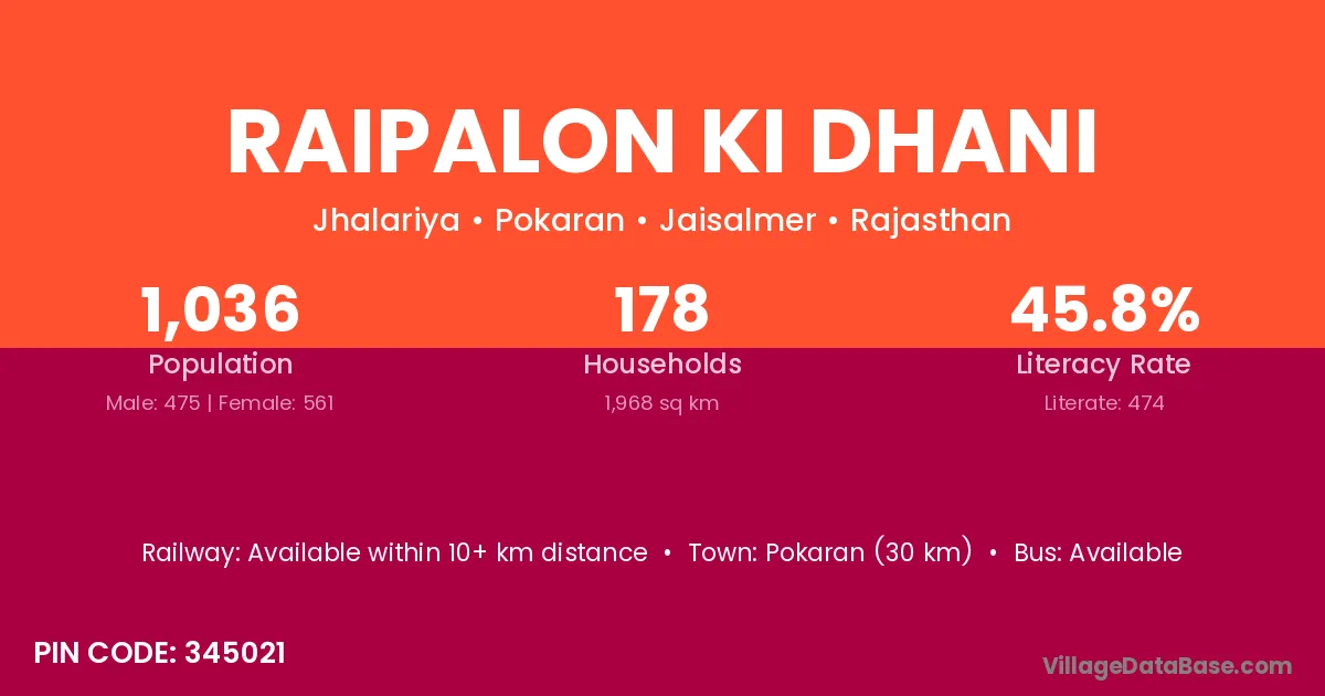 Pokaran (30 km) is the nearest town to Raipalon Ki Dhani village for major economic activities and is located approximately 30 km away.